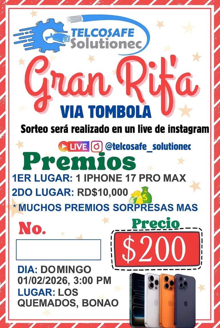 Participa en nuestra rifa oficial y gana premios increíbles. Con solo RD$200 puedes llevarte un iPhone 17 Pro Max, RD$10,000 en efectivo y muchas otras sorpresas. Sorteo en vivo vía Instagram el 01/02/2026.